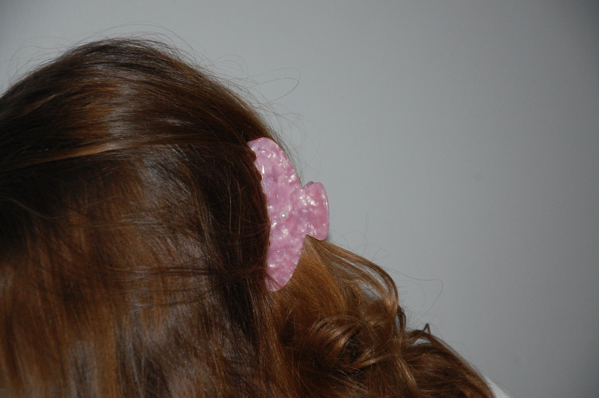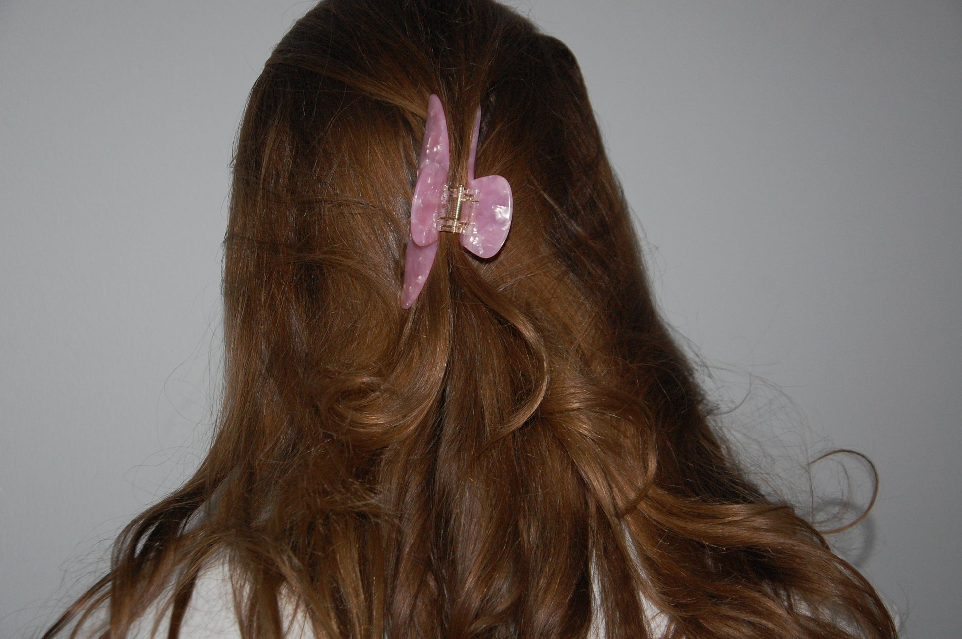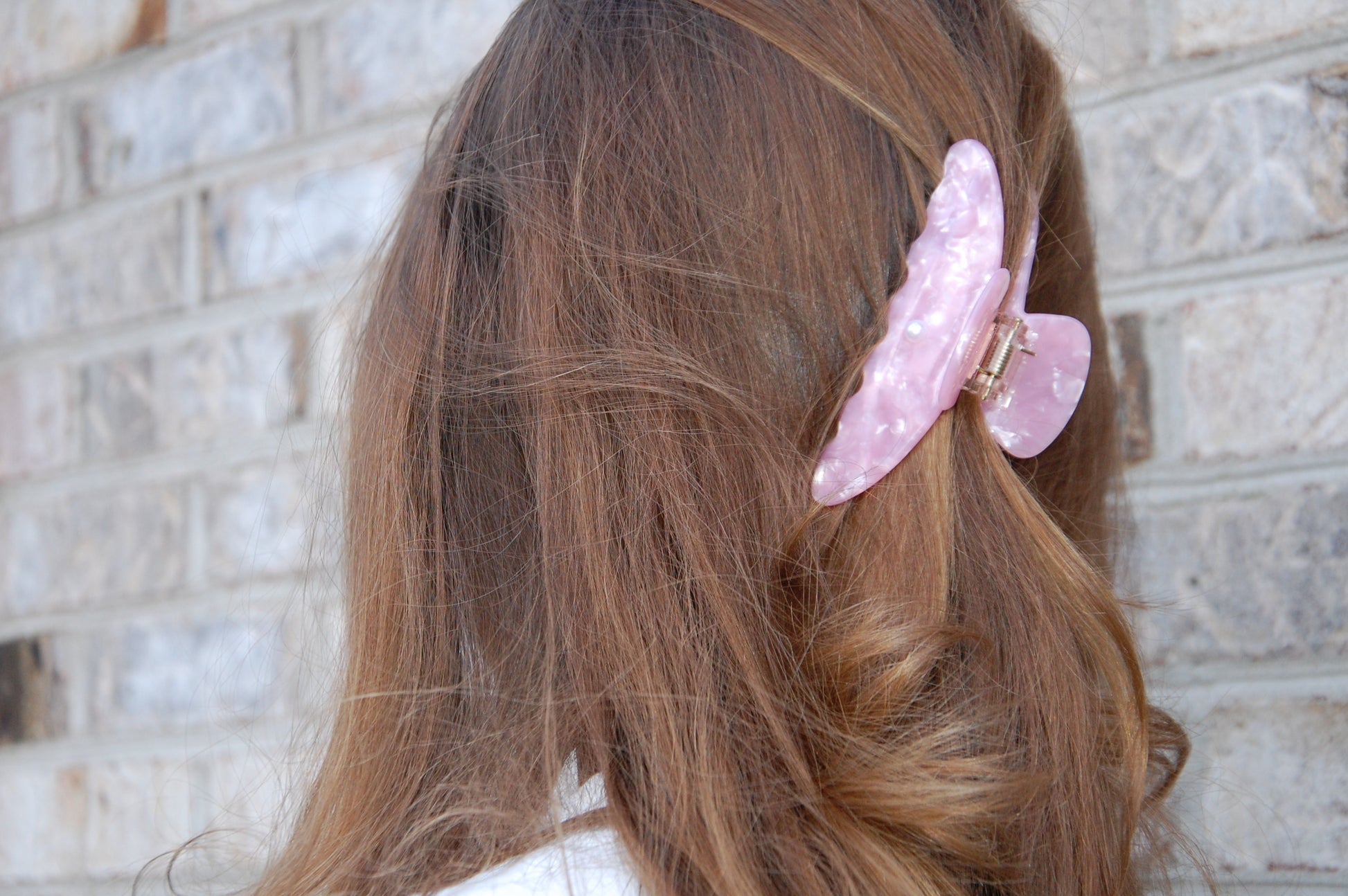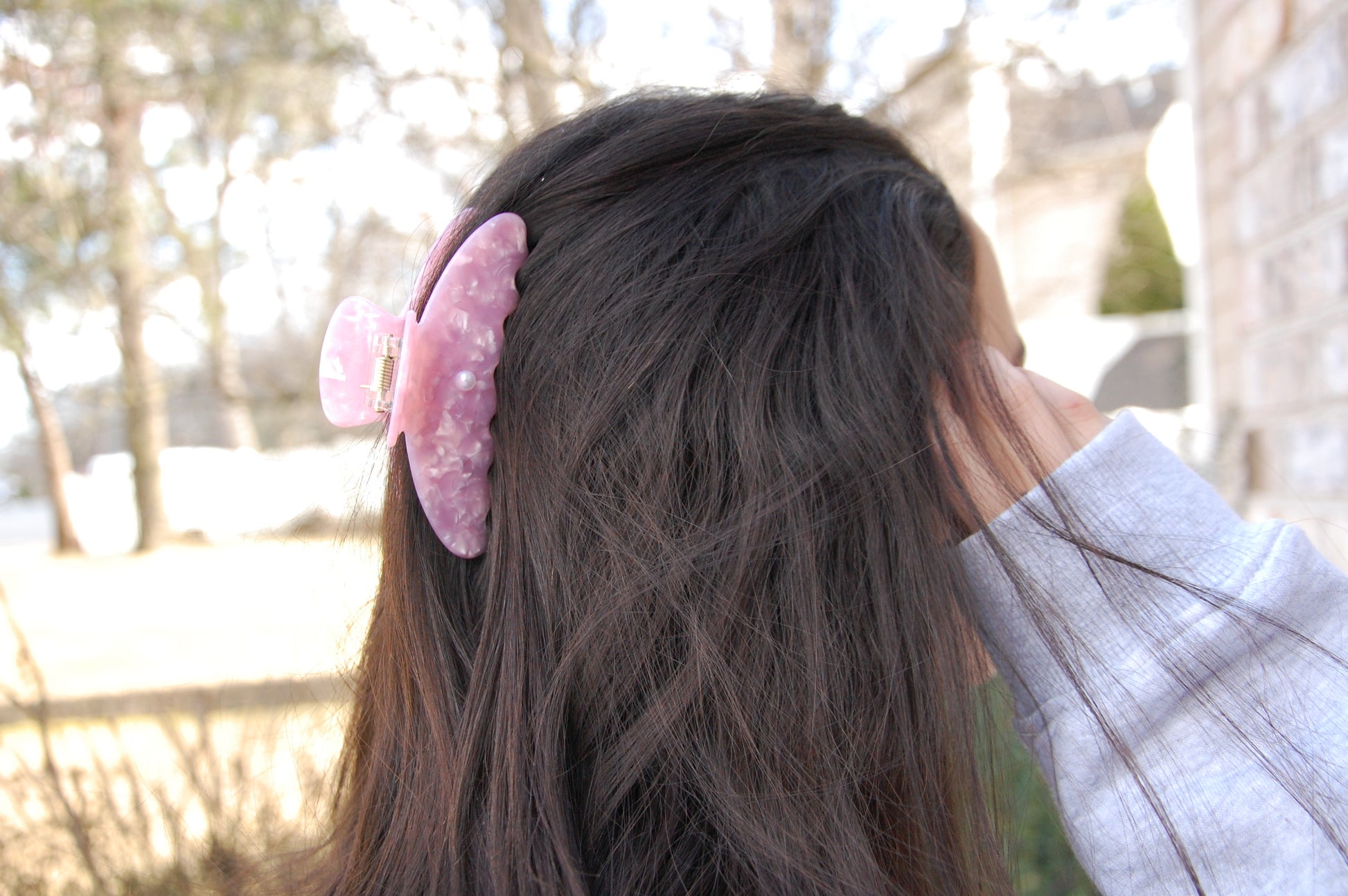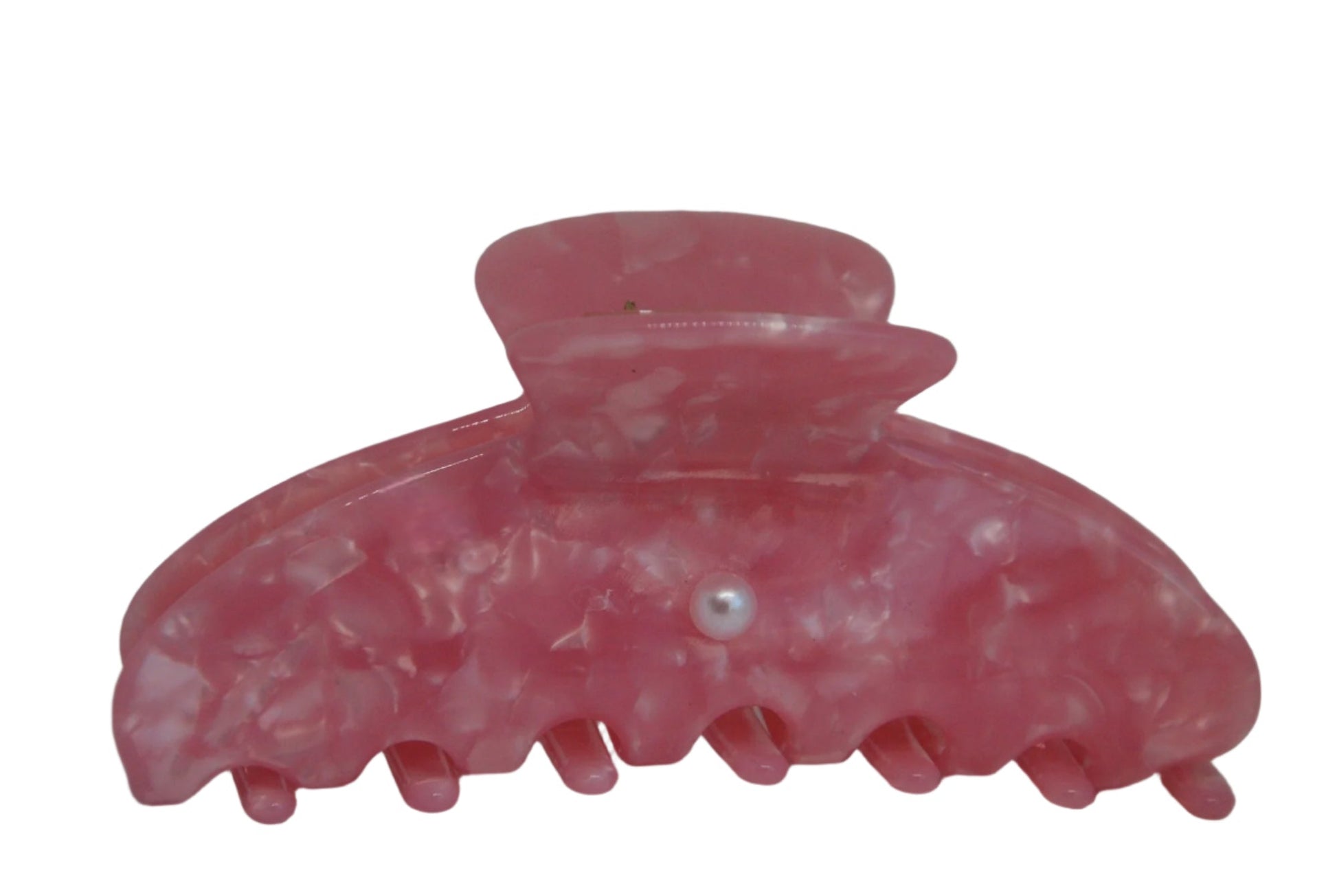Indulge in Sweet Dreams with this stunning pink marble claw clip adorned with a white pearl. Elevate your hair game with a touch of glamour and securely hold your hair in place!